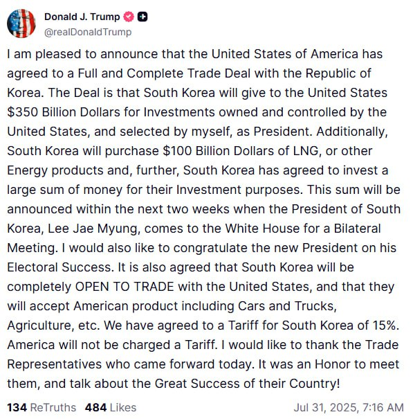 저는 미국이 대한민국과 완전하고 포괄적인 무역 협정을 체결했음을 기쁘게 발표합니다. 이 협정에 따라 한국은 미국이 소유하고 통제하며 제가 대통령으로서 선정한 투자에 대해 3,500억 달러를 미국에 제공할 것입니다. 또한, 한국은 1,000억 달러 상당의 LNG 또는 기타 에너지 제품을 구매할 것이며, 더 나아가 투자 목적으로 상당한 금액을 투자하기로 합의했습니다.
