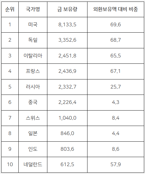 아래 표는 2023년 금보유량 상위 10개국에 대한 표이다.