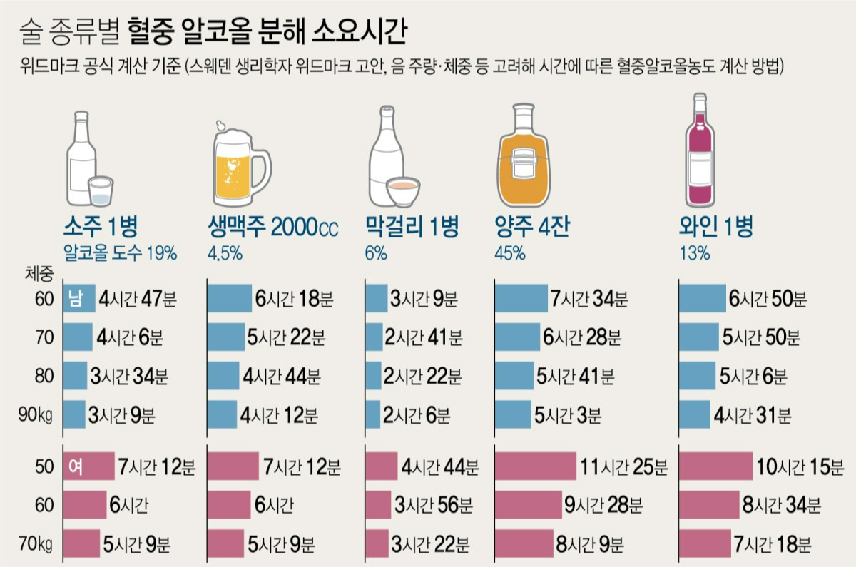 술 종류별 분해 시간 예시는 대략 다음과 같습니다 (체중 70kg 남성 기준):