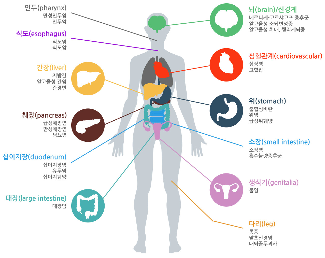 - 췌장: 알코올은 췌장 효소 분비와 인슐린 조절에 악영향을 끼쳐 췌장염이나 췌장암으로 진행할 수 있습니다.