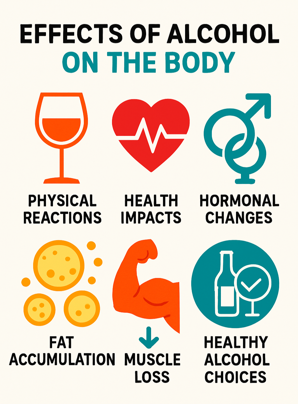 알코올은 근육 성장에 중요한 테스토스테론 수치를 낮추고, 근육 분해를 촉진하는 스트레스 호르몬인 코르티솔 수치를 높입니다. 이로 인해 근육량이 감소할 위험이 커집니다. - 탈수와 영양 흡수 방해