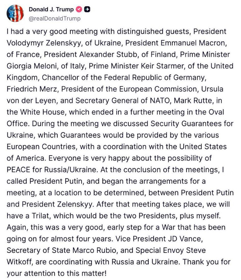 회의는 백악관에서 진행되었고, 이어 오벌 오피스에서 추가 회의가 있었습니다. 회의 중 우리는 우크라이나에 대한 안보 보장을 논의했는데, 이는 여러 유럽 국가들이 제공하고, 미국이 조정하는 형태가 될 것입니다. 모두가 러시아/우크라이나 평화의 가능성에 대해 매우 기뻐하고 있습니다.