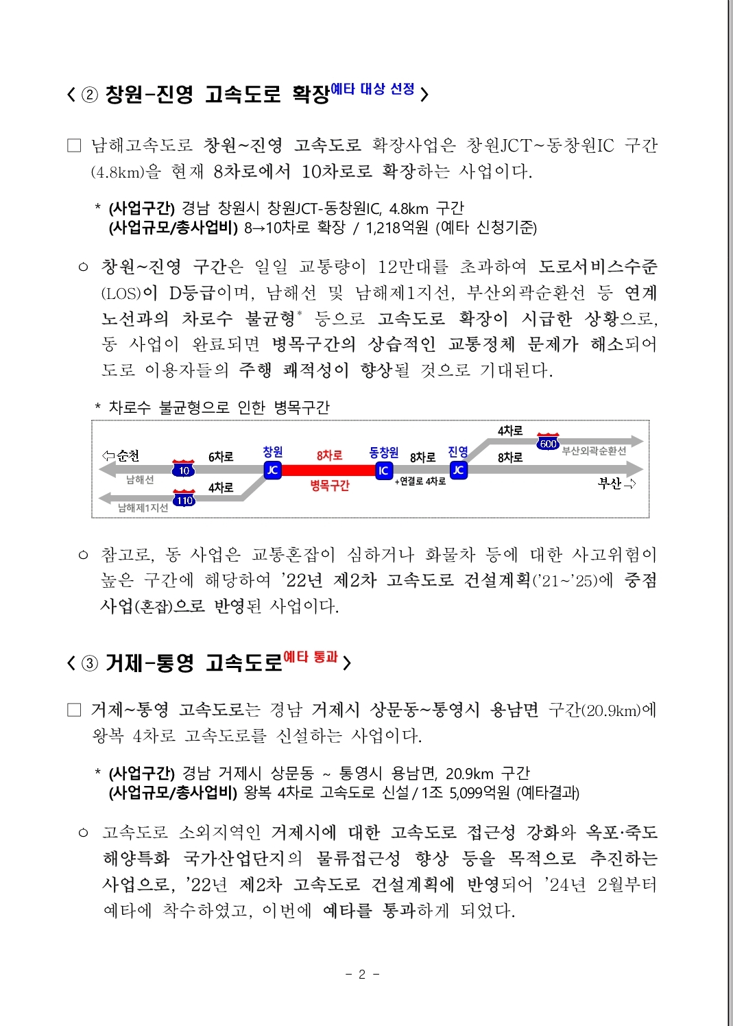 용인~과천 지하고속도로 신설,창원~진영 고속도로 확장, 거제~통영 고속도로 신설, 국도 15호선 고흥~봉래 확장 사업