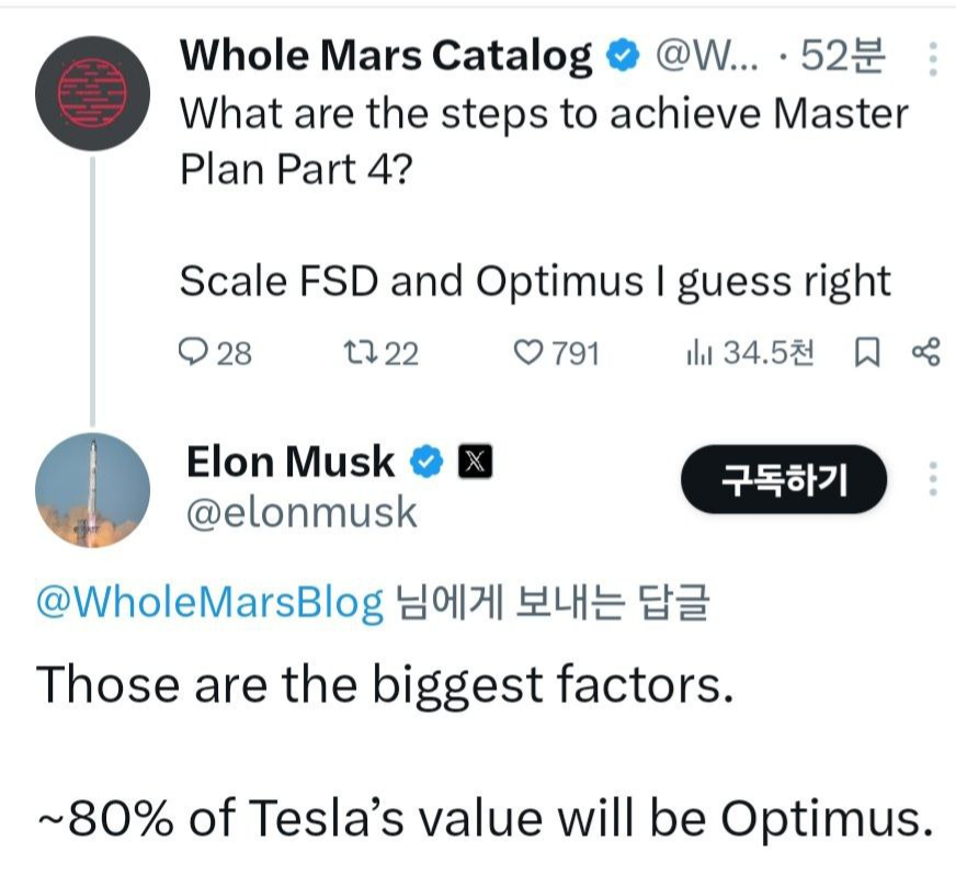 "Master Plan Part 4를 달성하기 위한 단계는 무엇인가요?" "아마 FSD와 Optimus 확장이라고 생각하는데 맞나요?" Elon Musk: "맞아요, 그게 가장 큰 요인들입니다. 테슬라 가치의 약 80%는 Optimus가 차지하게 될 겁니다." |