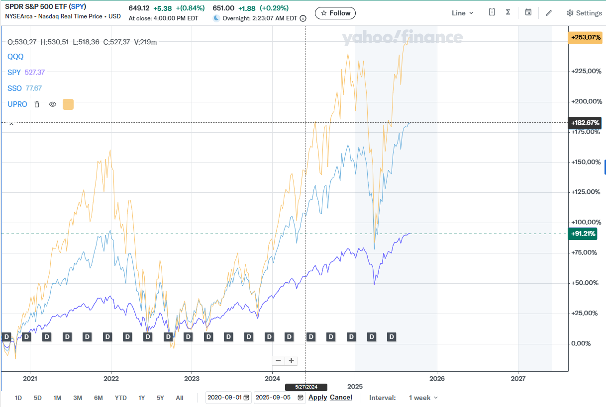 5년동안 SPY는 91%, SSO는 182%, UPRO는 253% 상승하여 2배와 3배 정도의 상승하였으며,