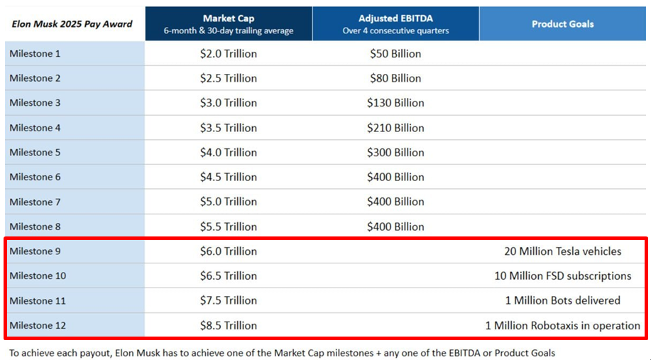 2025년 CEO 성과 보상(Performance Award)은 일론 머스크가 테슬라의 시가총액을 2조 달러에서 최대 8.5조 달러까지 달성해야 하며(현재 시가총액은 1.06조 달러), 각 구간별 시총 목표를 충족해야 합니다.