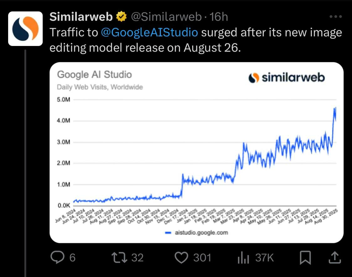 - 구글 AI 스튜디오 트래픽은 8/26일 이후 급격히 상승