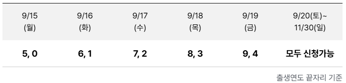 - 9.15(월) 09:00 ~ 11.30(일) 24:00* 시스템 점검시간(23:30 ~ 익일 00:30)은 신청불가