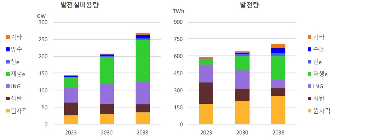 11차 계획에 의하면 전력소비량은 2024년 557.1TWh에서 2038년 735.1TWh로 연평균 2.0% 증가하고, 하계 최대전력은 104.2GW에서 145.6GW로 연평균 2.4% 증가할 것으로 전망된다. 특히 추가수요는 전력소비량 증가의 약 40% 이상을 설명하며, 구체적으로 전기화 63.0TWh, 데이터센터 15.5TWh, 첨단산업 1.1TWh가 포함된다. 또한 계절 간 피크 수요 격차도 확대될 것으로 보인다. 냉방 수요가 집중되는 여름철의 전력 피크는 점점 뚜렷해지는 반면, 난방에너지원 다변화로 겨울 피크 수요는 비교적 완만하게 증가할 것으로 예상된다.