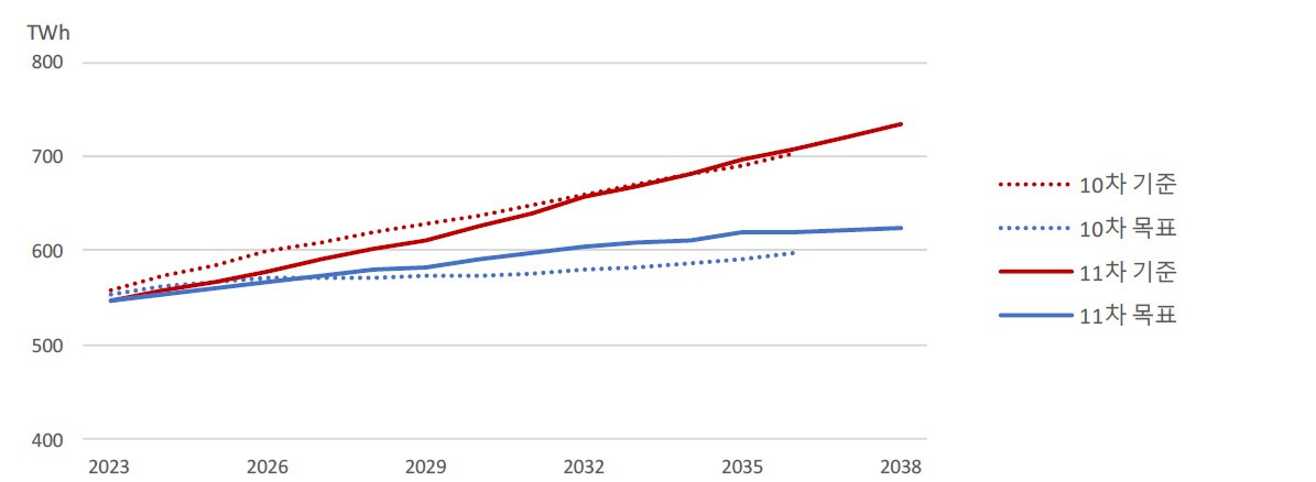 2036년을 기준으로 10차 계획의 전망 결과와 비교하면 전력 수요가 10차 703.2TWh에서 11차 707.9TWh로 11차에서 소폭 상향 조정되었다. 각각의 모형 수요는 642.9TWh, 642.5TWh로 거의 유사하나 추가수요에서 다소 차이가 발생했다. 최대전력의 경우, 10차와 11차가 2036년 기준 각각 135.6GW, 138.2GW로 역시 11차에서 다소 높게 예측되었다. 최대수요 역시 각각의 모형 수요는 125.2GW, 124.5GW로 비슷하나 추가수요 부분에서 11차가 높게 전망되었다. 이처럼 추가수요 부분에서 이전 계획 대비 전망치가 높아진 것은 이전에 고려하지 않았던 첨단산업 수요가 추가되고 전기화 수요가 상향 조정되었기 때문이다.