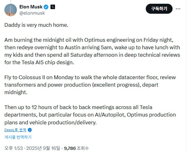 ![]() | 일론 머스크 금요일 밤에는 Optimus 엔지니어링과 밤샘 작업을 하고, 이어서 레드아이(red-eye) 비행기로 새벽 5시에 오스틴에 도착, 아이들과 점심을 함께하고 토요일 오후 내내 Tesla AI5 칩 설계를 위한 심층 기술 검토에 몰두합니다. 월요일에는 Colossus II로 날아가 데이터센터 전체를 둘러보고, 변압기와 전력 생산을 점검합니다(진행 상황은 매우 우수). 자정에 출발합니다. 그 후 Tesla의 모든 부서를 대상으로 최대 12시간 동안 연속 회의를 진행하지만, 특히 AI/Autopilot, Optimus 생산 계획, 차량 생산 및 인도에 중점을 둡니다. |
