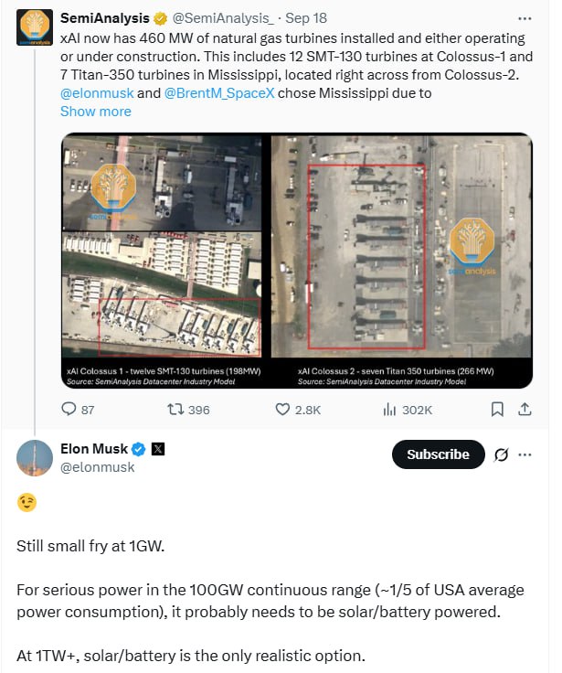 현재 xAI는 천연가스 발전 기반 데이터센터 전력을 확보하는 중