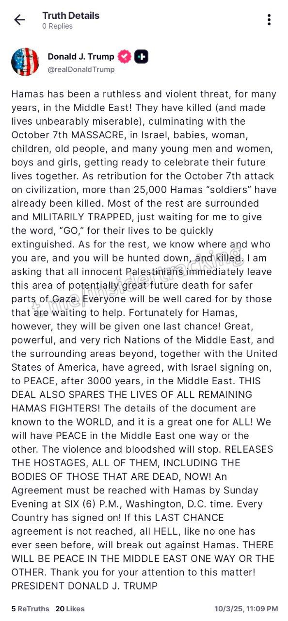 | 트럼프 하마스에 대한 인질석방을 요청 (하마스에 대한 마지막 협정 기회)_하마스 회신에 대한 트럼프의 성명, 이스라엘에 가자지구 폭격 중단 요청 (0) | 2025.10.04 |
