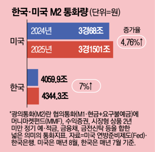 우리나라도 비슷한 흐름으로 지난해 7월 4059조9000억원이었던 M2는 올해 7월 4344조3000억원에 이르렀습니다. 1년 만에 7%나 늘어난 것으로 증가세로 따지면 미국보다 더 가파르며, 우리나라 증시가 미국보다 높은 이유 일 수 있습니다.