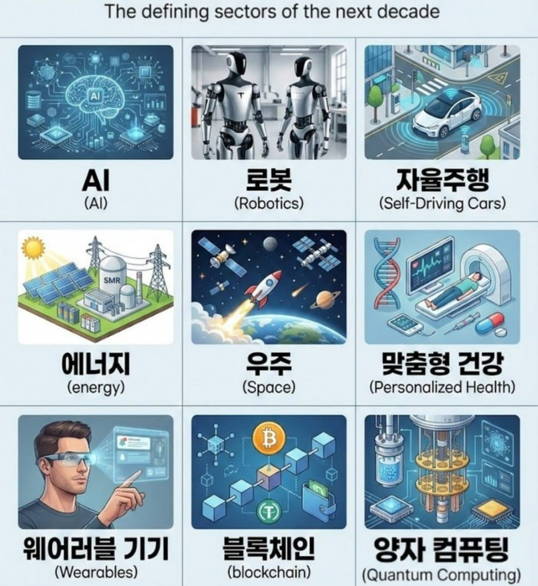 로봇 (Robotics): 제조 현장을 넘어 가사, 물류, 서비스업으로 확장되는 인간형 로봇(휴머노이드) 기술을 포함합니다.
