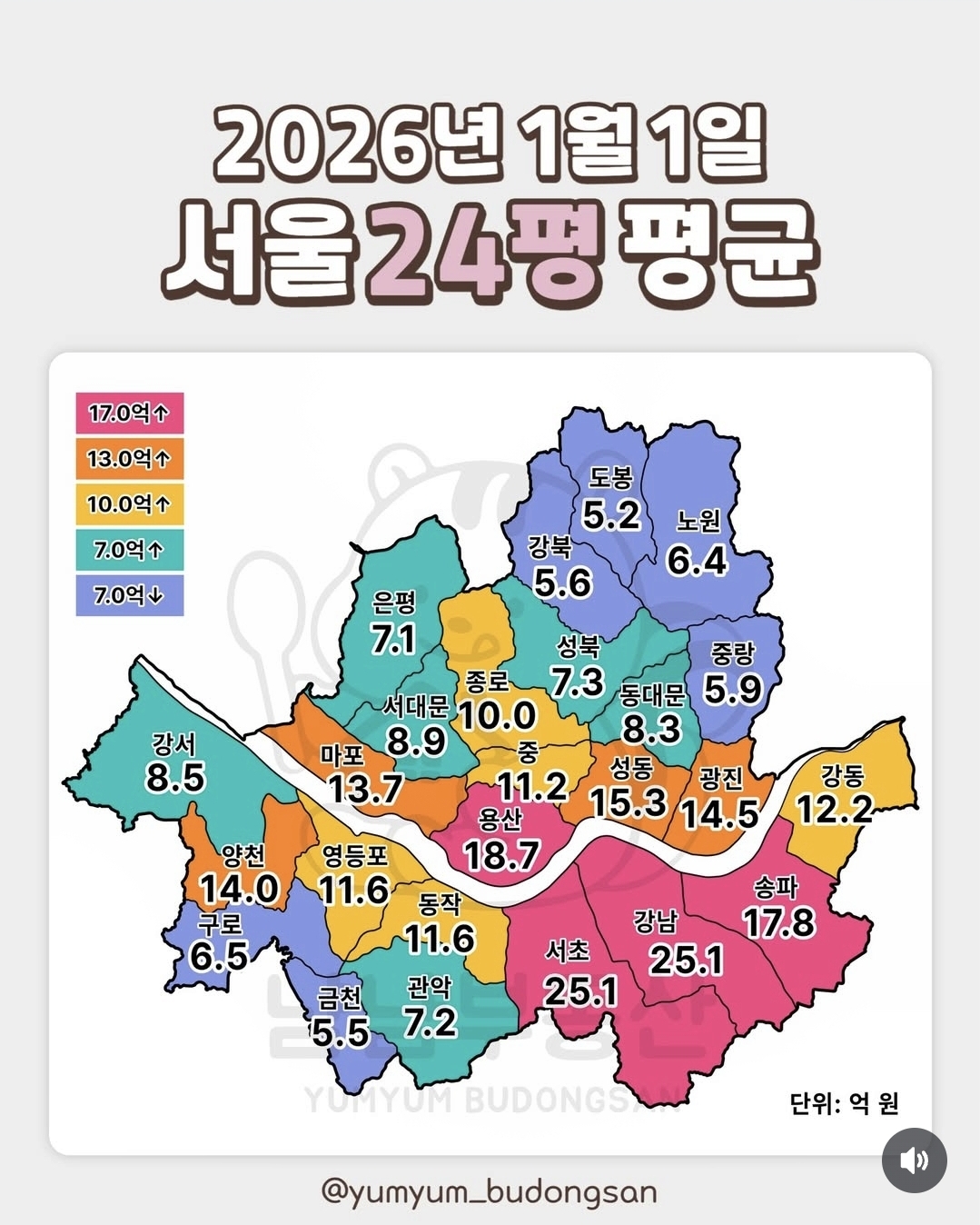 2026년 1월 1일 서울 지역구별 국평(32형), 24평형 아파트 평단가