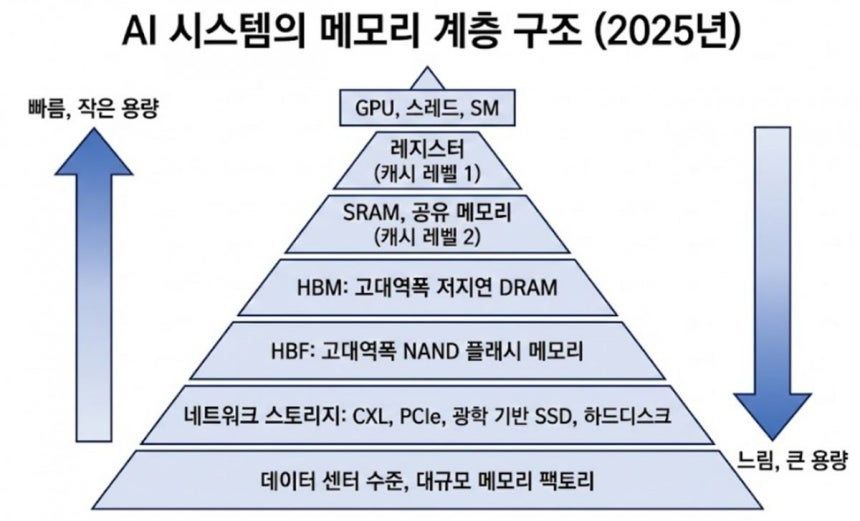 HBF는 HBM을 대체하지 않고, HBM 바로 뒤에서 초대용량 파라미터 저장/전송을 담당하는 2차 계층 메모리