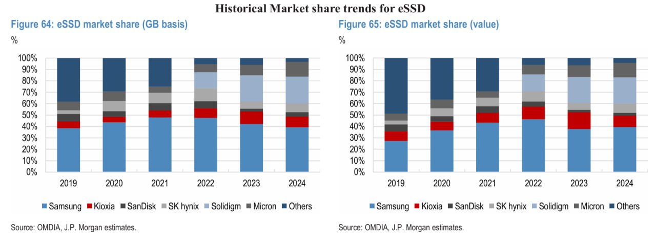 JPM 추정에 따르면 eSSD 비트 수요가 2025-2028년 연평균 49% 성장하여 2028년에는 전체 NAND 비트 믹스의 53%를 차지할 전망입니다. 2024년 eSSD 출하량은 전년 대비 86% 증가했으며, 이는 2012년 이후 가장 높은 성장률입니다.