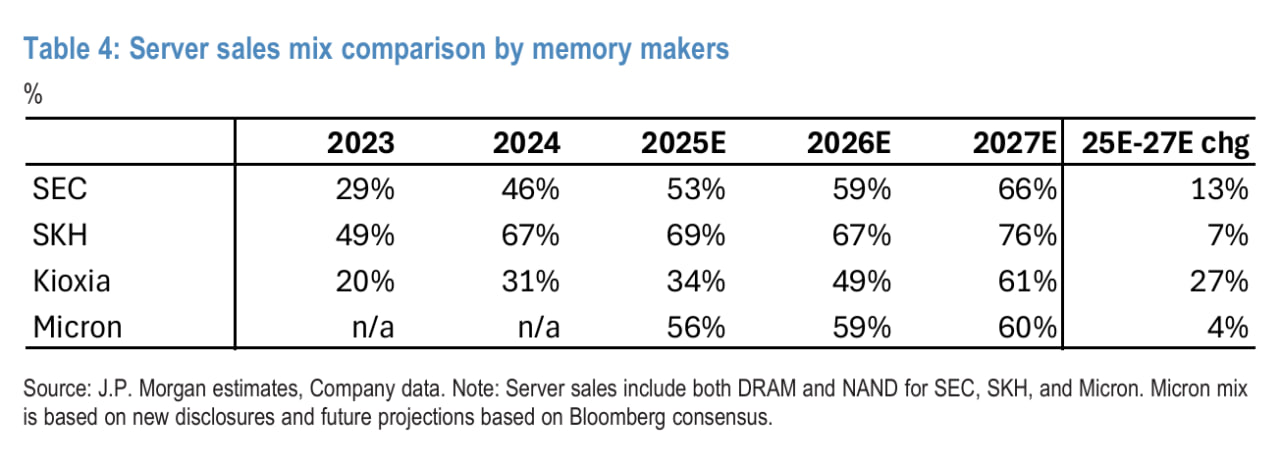 JPM은 아시아 메모리 공간에서 순수 NAND 플레이로 Kioxia를 선호합니다(신규 비중확대 의견). Kioxia는 업계 평균을 상회하는 서버 믹스 확장 성장 프로파일을 보유하고 있습니다. eSSD 사업 비교에서 메모리 제조사(NAND 노출만 가정) 중 SK하이닉스가 약 48%로 가장 높은 서버 믹스 노출도를 보이며, 주로 Solidigm의 QLC 분야 리더십 덕분입니다. Kioxia가 그 뒤를 잇고 삼성전자가 따릅니다.