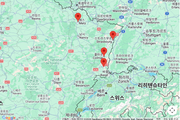 - 륄루즈 (Mulhouse): '프랑스의 맨체스터'라고 불릴 만큼 섬유와 기계 산업이 발달했던 도시입니다. 19세기 산업혁명기 알자스 경제를 견인했던 중공업의 중심지입니다.