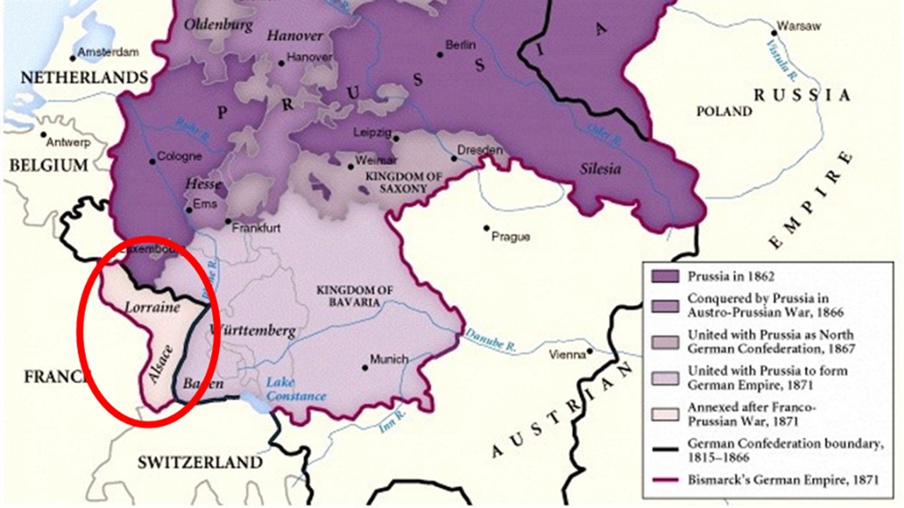 * 합병: 1870년 프로이센-프랑스 전쟁(보불전쟁)에서 프랑스가 패배하면서, 1871년 체결된 프랑크푸르트 조약에 따라 알자스(벨포르 제외)와 로렌의 북동부 지역(주로 독일어권)이 독일 제국에 양도되었습니다.