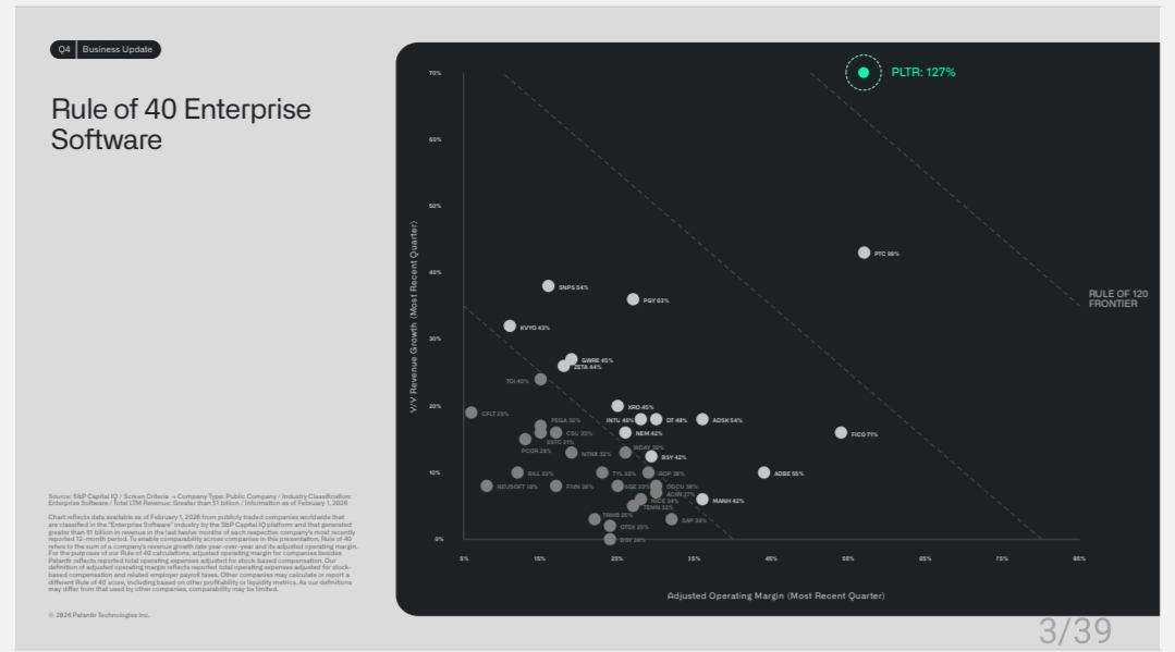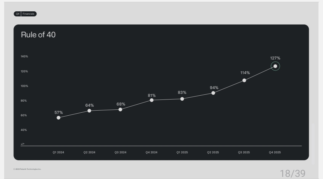 "팔란티어의 Rule of 40 점수는 현재 믿기 힘든 수준인 127%에 도달했습니다."