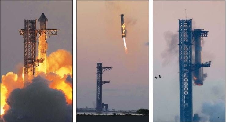 기존에 로켓회수방식 (바다위 드론 선박위에 착륙) 하는것이 아닌 로켓이 공중에서 발사 타워에 장착하여 회수하는 방식으로, 스타쉽의 슈퍼 헤비 부스터는 다시 발사대에 복귀하여 메카질라의 팔에 잡히게 됩니다.