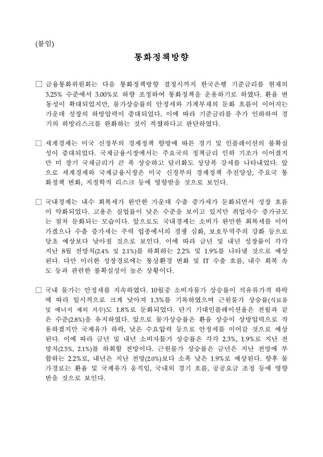 한국은행 기준금리 3.25%에서 3.00%로 0.25%p 하향 조정